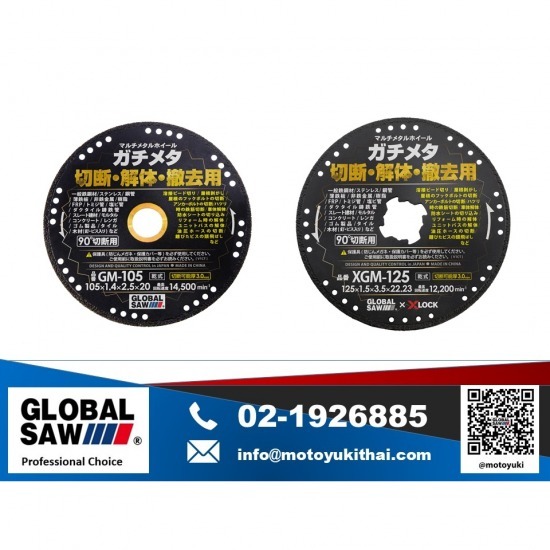 ใบตัดวงเดือนผลึกเพชร ใบตัดวงเดือนชนิดใหม่ประกอบด้วยผงผลึกเพชร สำหรับใช้กับเครื่องเจียร์ รุ่น GM และ XGM เหมาะสำหรับงานตัดทั่วไปและงานรื้อถอน คุณสมบัติเด่น ใบตัดชนิดนี้มีอายุการใช้งานที่ยาวนาน จำนวนตัดได้มากกว่า 123 เท่าของใบตัดบางทั่วไป ใช้ตัดวัสดุได้หลากหลายเกือบทุกชนิด เช่นเหล็ก, สแตนเลส, อลูมิเนียม, ยาง, ไม้ รวมถึงท่อไฮดรอลิค ขนาดความโตของใบจะคงที่ไม่ลดลงเมื่อใช้งานไปเรื่อยๆ ไม่จำเป็นต้องเปลี่ยนจนกว่าจะหมดอายุการใช้งาน GM Model สำหรับเครื่องเจียร์ที่จับยึดใบแบบธรรมดา มีขนาด 105 และ 125 มม. XGM Model สำหรับเครื่องเจียร์ที่จับยึดใบแบบ X-Lock มีขนาด 105 และ 125 มม.